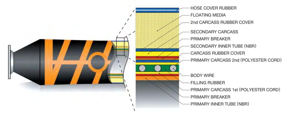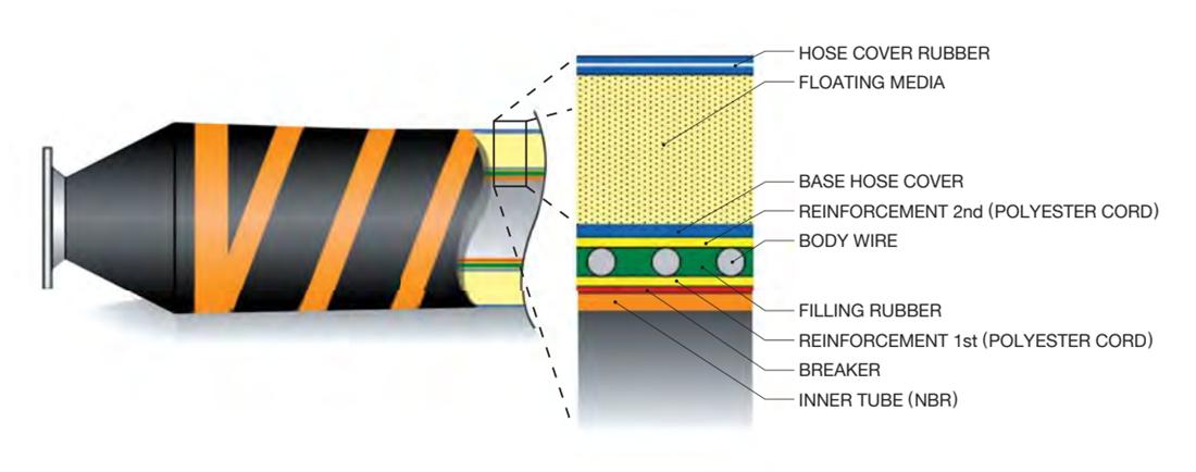 このホースには、一端に追加の補強層があります。その構造は、フローティングホースと水中ホースの中間のようなものです。通常、完全にフローティングしているメインライン ホースと水中ホースの間のつなぎとして使用されます。